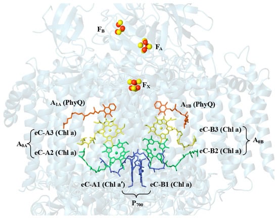 In T. elongatus, P700 is a Chl a/Chl a′ heterodimer and A0 is a Chl a homodimer. In contrast, P740 is a Chl d/Chl d′ heterodimer [,], and the eC-2 and eC-3 cofactors in each branch are a Chl d and pheophytin, respectively, in A. marina. The phylloquinones, A1A and A1B, and three [4Fe4S] clusters FX, FA, and FB are similar in both organisms. Despite the differences in some of the cofactors, the arrangement of these pigments is identical in A. marina and T. elongatus [].