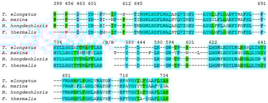 Alignment of PsaA sequences (rings) from of T. elongatus (PDB ID: 1JB0) [,], A. marina (PDB ID: 7COY) [], H. hongdechloris (PDB ID: 6KMX) [] and F. thermalis (PDB ID: 7LX0) []. Conserved residues are shown in cyan, and non-conserved residues are especially noted in the P700-cofactor environment. Numbering of residues is based on the T. elongatus sequence for consistency across species. For example, Thr743A (T. elongatus) is Ser in H. hongdechloris/A. marina, and Ala658A (T. elongatus) is Ser in F. thermalis. These differences lie adjacent to water-mediated H-bond networks and are expected to influence the hydrogen bonding and electrostatic stabilization of the P700 chlorophylls. The alignment highlights how specific substitutions in far-red–adapted species may tune the PSI protein–cofactor interface.