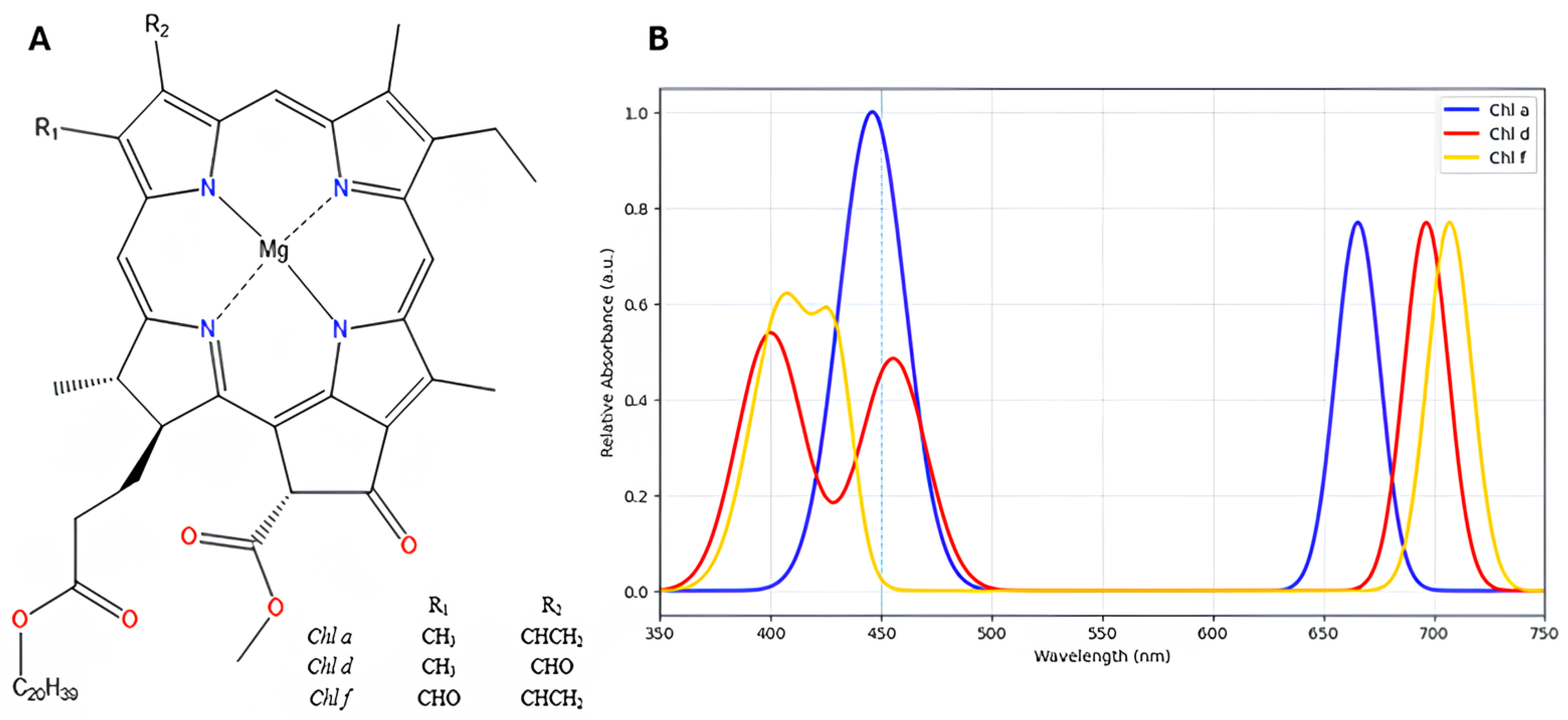 (A) Chemical structures of chlorophyll a, d, and f. (B) Absorbance spectra generated using the experimental extinction coefficient values of chlorophyll a, d and f in 100 % methanol, as reported in Table 2 of Li et al. (2012) []. The experimental spectrum and λmax values can be found in Figure 1 and Table 2, respectively, of the reference Li et al. (2012) [].