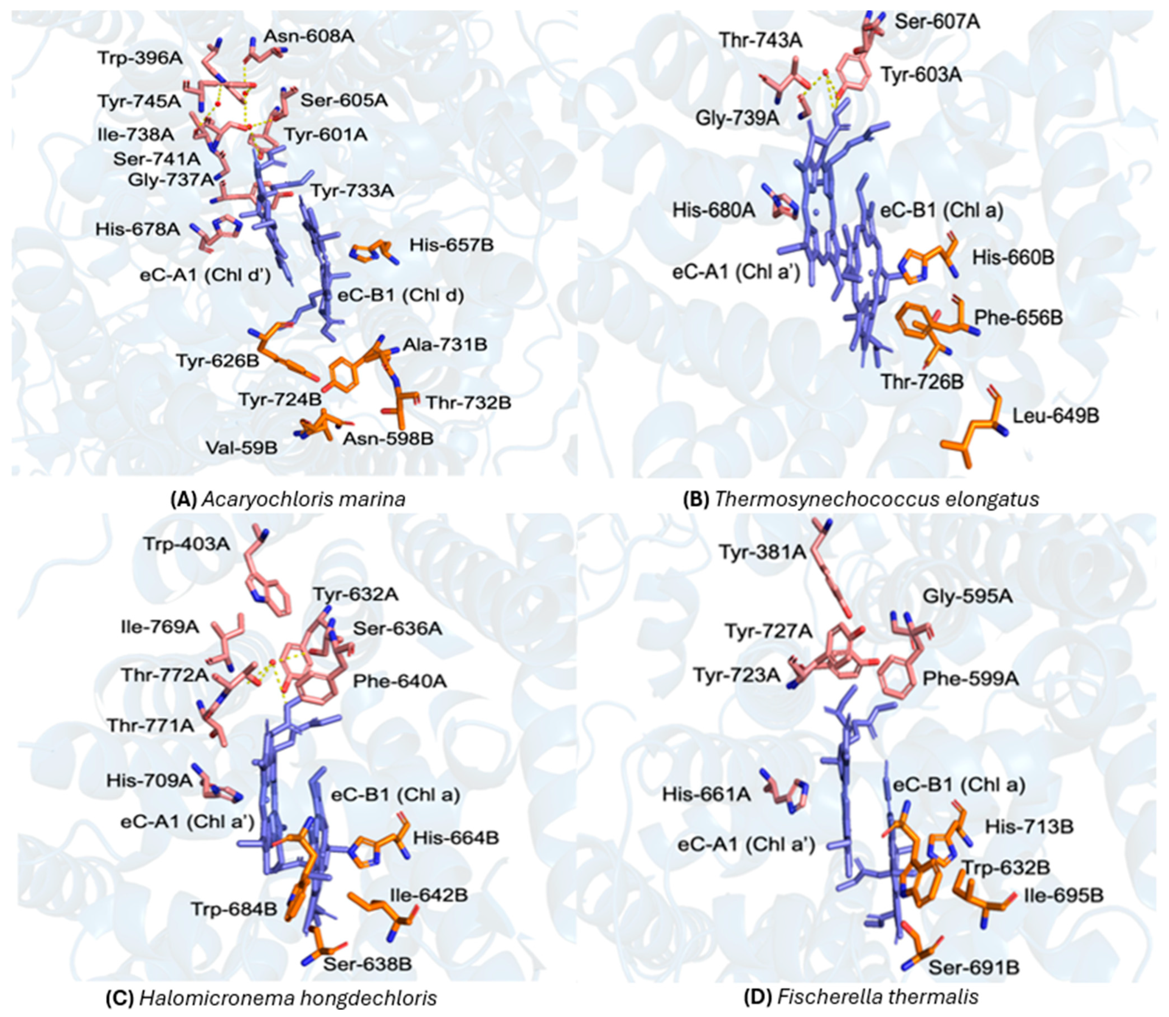 Comparison of the primary donor sites and their local protein environments in Photosystem I (PSI) from four cyanobacterial species. (A) Acaryochloris marina (P740; PDB ID: 7COY) []: the Chl d′ (eC-A1) and Chl d (eC-B1) molecules are shown in blue, with surrounding residues from PA and PB depicted in pink and orange, respectively, and this color scheme is applied to all organisms in this study. Key A-branch residues include Trp-396A, Ile-738A, Asn-608A, Tyr-601A, Ser-605A, Tyr-733A, Tyr-745A, Ser-741A, and Gly-737A, coordinated by His-678A; B-branch residues include Tyr-724B, Ala-731B, Thr-732B, Val-594B, Asn-598B, and Tyr-626B, coordinated by His-657B. Three nearby water molecules (red spheres) and their putative hydrogen bonds (yellow dashed lines) are indicated []. (B) Thermosynechococcus elongatus (P700; PDB ID: 1JB0) []: Chl a′ (eC-A1) and Chl a (eC-B1) are shown in blue. The A-branch includes Tyr-603A, Ser-607A, Gly-739A, Thr-743A, and His-680A, while the B-branch comprises Phe-656B, Leu-649B, Thr-726B, and His-660B. A water molecule (red sphere) and its hydrogen-bond network (yellow dashed lines) illustrate stabilizing interactions near the donor []. (C) Halomicronema hongdechloris (P700; PDB ID: 6KMX) []: Chl a′ (eC-A1) and Chl a (eC-B1) are shown in blue. The water molecule is shown as a red sphere. (D) Fischerella thermalis (PDB ID: 7LX0): the primary donor environment closely resembles that of H. hongdechloris []. At the reported 2.96 Å resolution, only strongly bound waters could be modeled; thus, the apparent absence of water or hydrogen-bond interactions likely reflects limited structural resolution rather than a true lack of water molecules [].