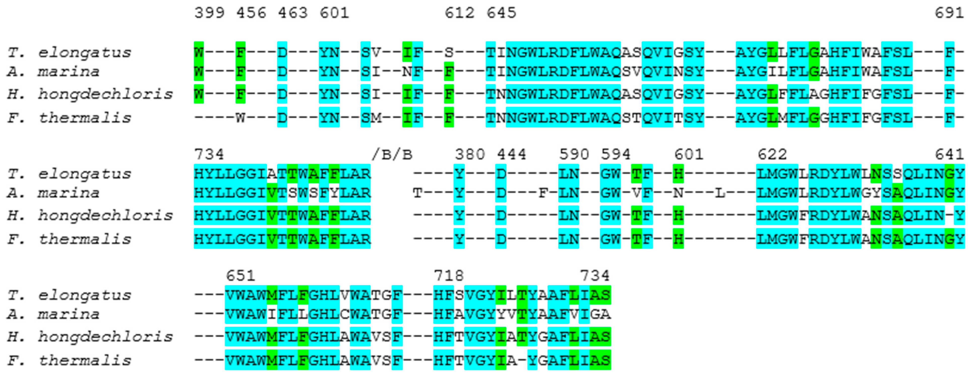 3.4. Comparative Analysis of the Protein Environment Surrounding P700 in H. hongdechloris, F. thermalis and T. elongatus