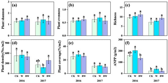 Effects of increased precipitation (W) and arbuscular mycorrhizal fungi suppression (BW) on plant community in 2016 and 2017. (a) Plant Shannon–Wiener diversity index; (b) plant Pielou’s evenness index; (c) richness; (d) plant density; (e) plant coverage; and (f) above-ground net primary productivity (ANPP). CK, ambient precipitation treatment; error bars indicate ± SE. Different letters above the error bar indicate significant differences among treatments based on LSD’s post hoc test when p < 0.05. ANOVA results see Table S2.