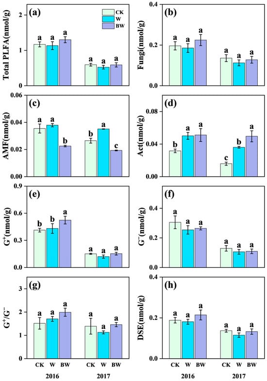 Effects of increased precipitation (W) and arbuscular mycorrhizal fungi suppression (BW) on microbial community in 2016 and 2017. (a) Total PLFA content of soil microbial community (Total PLFA); (b) fungi; (c) arbuscular mycorrhizal fungi (AMF); (d) Actinomycetes (Act); (e) Gram-positive bacteria (G+); (f) Gram-negative bacteria (G−); (g) the ratio of G+ (PLFA) and G−(PLFA)(G+/G−); (h) dark septate endophytes (DSE). CK, ambient precipitation treatment; error bars indicate ± SE. Different letters above the error bar indicate significant differences among treatments based on LSD’s post hoc test when p < 0.05. ANOVA results see Table S3.