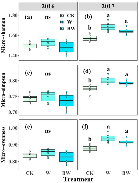 Effects of increased precipitation (W) and arbuscular mycorrhizal fungi suppression (BW) on microbial community diversity in 2016 and 2017. (a,b): Microbial Shannon–Wiener diversity index (Micro-Shannon); (c,d): microbial Simpson index (Micro-Simpson); (e,f): microbial Pielou’s evenness index (Micro-evenness). CK, ambient precipitation treatment; error bars indicate ± SE. Different letters above the error bar indicate significant differences among treatments based on LSD’s post hoc test when p < 0.05. ANOVA results see Table S3.