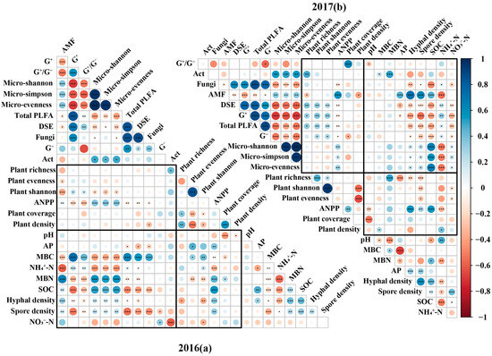 Correlation analysis among soil physicochemical properties, microbial communities, and plant communities in 2016 (a) and 2017 (b). Note: G−: Gram-negative bacteria; G+: Gram-positive bacteria; Act: Actinobacteria; AMF: arbuscular mycorrhizal fungi; G+/G−: the ratio of G+ (PLFA) and G− (PLFA); Total PLFA: total PLFA content of soil microbial community; DSE: dark septate endophytes; Micro-Shannon: microbial Shannon–Wiener diversity index; Micro-Simpson: microbial Simpson index; Micro-evenness: microbial Pielou’s evenness index; AP: available phosphorus; MBC: microbial biomass carbon; MBN: microbial biomass nitrogen; NH4+-N: ammonium nitrogen; NO3−-N: nitrate nitrogen; SOC: soil organic carbon; Plant shannon: plant Shannon–Wiener diversity index; Plant evenness: plant Pielou’s evenness index; ANPP: above-ground net primary productivity. *, p < 0.05; **, p < 0.01; ***, p < 0.001.