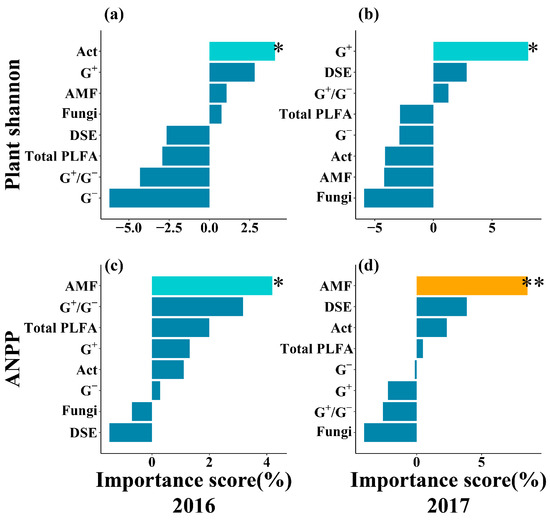 Relative importance of microbial community for predicting the plant community from random forest analysis. (a,b): Plant Shannon–Wiener diversity index (Plant Shannon); (c,d): above-ground net primary productivity (ANPP). G−: Gram-negative bacteria; G+: Gram-positive bacteria; Act: Actinobacteria; AMF: arbuscular mycorrhizal fungi; G+/G−: the ratio of G+ (PLFA) and G−(PLFA); Total PLFA: total PLFA content of microbial communities; DSE: dark septate endophytes. *, p < 0.05; **, p < 0.01.