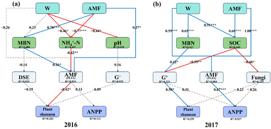 Structural equation modeling (SEM) showing the causal pathways by which arbuscular mycorrhizal fungi (AMF) and increased precipitation (W) influence plant community in 2016 and 2017. (a) p = 0.381; RMSEA = 0.057; GFI = 0.847; AIC = 15.266; df = 28. (b) p = 0.174 RMSEA = 0.125; GFI = 0.976; AIC = 0.638; df = 21. MBN: microbial biomass nitrogen; NH4+-N: ammonium nitrogen; SOC: soil organic carbon; DSE: dark septate endophytes; G−: Gram-negative bacteria; G+: Gram-positive bacteria; Plant Shannon: plant Shannon–Wiener diversity index; ANPP: above-ground net primary productivity. Red and blue solid arrows indicate negative and positive significant effects, respectively, and black dashed lines indicate non-significant effects. The numbers above the arrows indicate the magnitude of the standardized SEM coefficients (*, p < 0.05; **, p < 0.01; ***, p < 0.001). R2 values represent the proportion of variance explained for each variable.