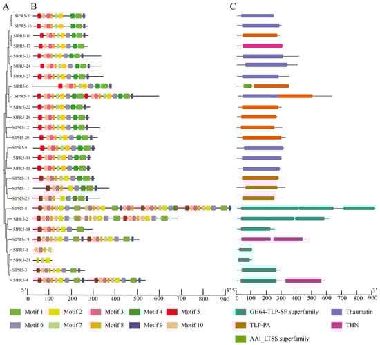 NJ tree, motif and domain of SlPR5 in tomato. (A), NJ tree constructed by MEGA 7.0 software using SlPR5 family members. (B), Motif positions of tomato SlPR5 family members. The ten motifs are displayed in different colors. (C), Domain positions of tomato SlPR5 family members. The scale at the bottom shows the length of the motif and domain.