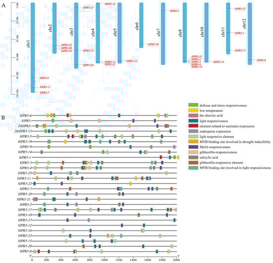 Chromosomal mapping and cis-acting elements of the SlPR5 genes in tomato. (A) The chromosome number is located to the left of each chromosome, and the scale value on the left corresponds to the chromosome length. (B) The different colored squares represent different cis-acting elements.