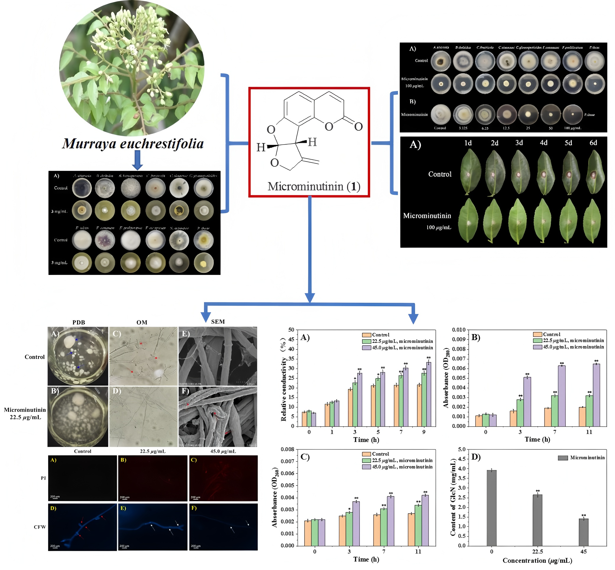 Cao D-T, Yao Y-J, Fu X-X, Song W-W, Liu X-Y, Zhang P, Zhou Q-H, Li B-T, Peng W-W. Microminutinin, a Fused Bis-Furan Coumarin from Murraya euchrestifolia, Exhibits Strong Broad-Spectrum Antifungal Activity by Disrupting Cell Membranes and Walls. Plants. 2025; 14(21):3392. https://doi.org/10.3390/plants14213392