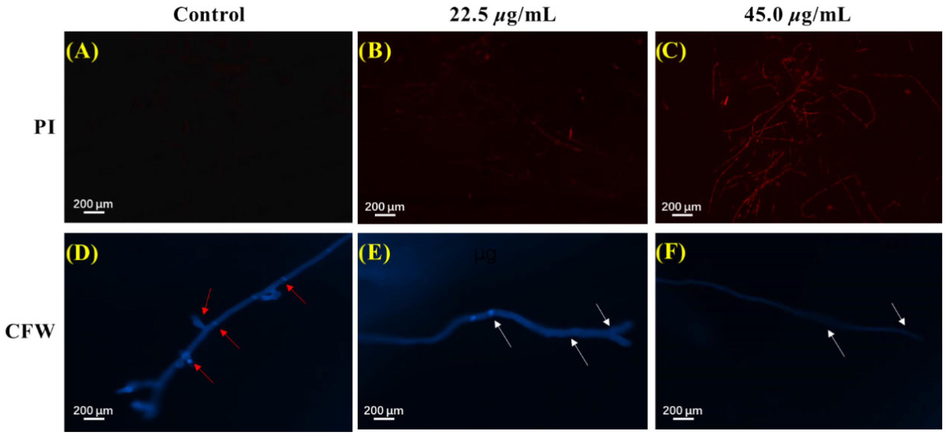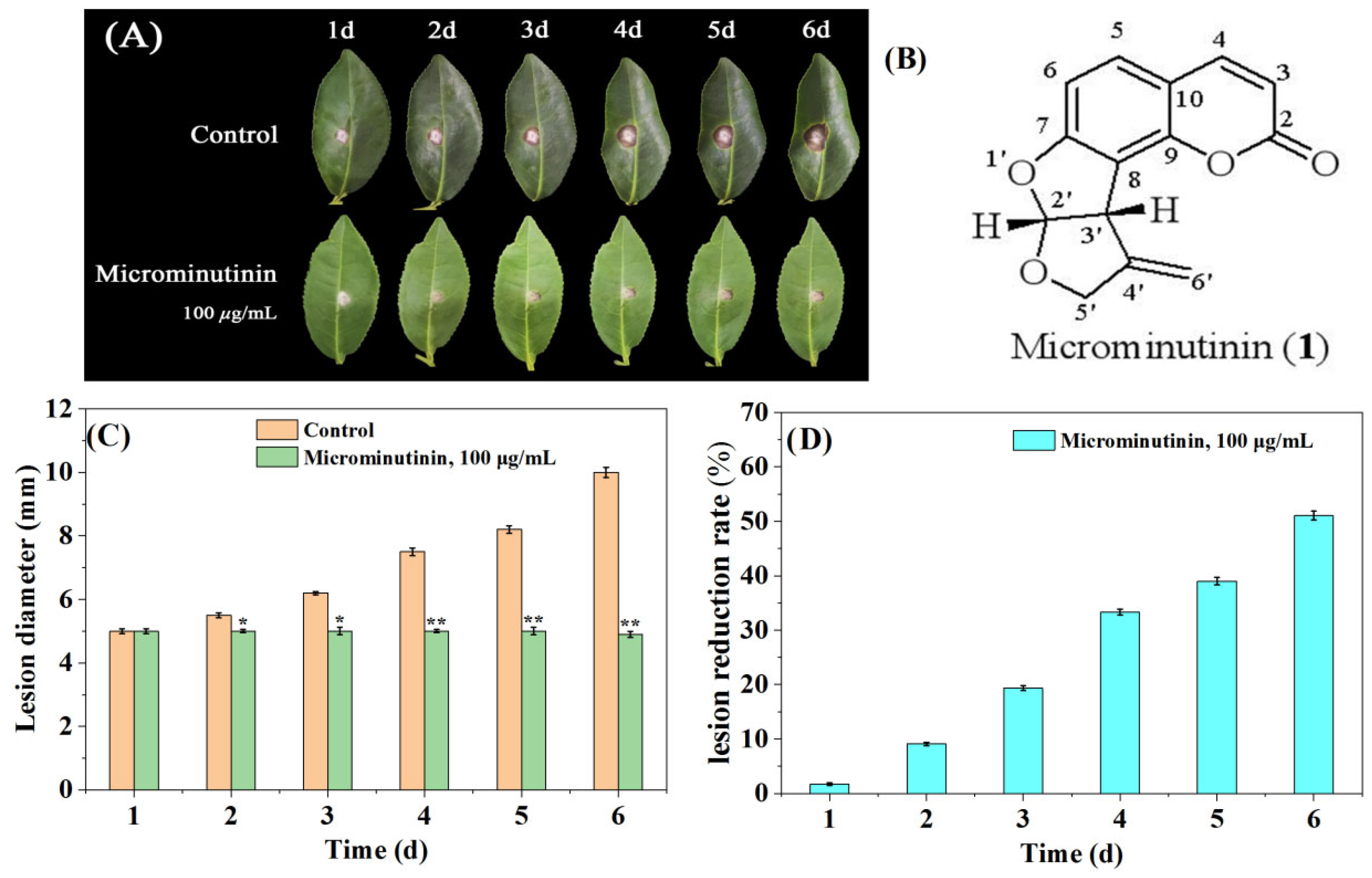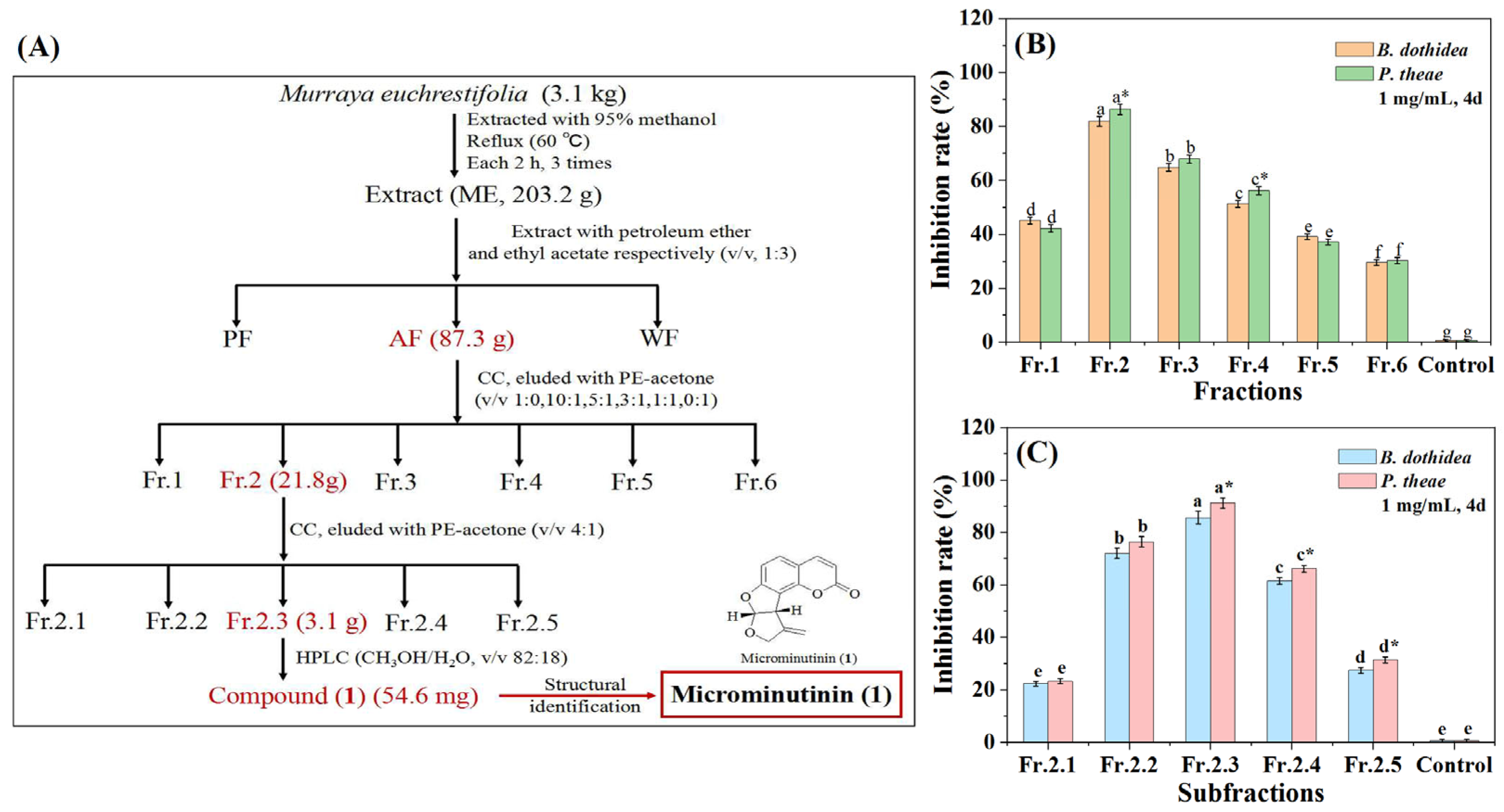 Chicago/Turabian StyleCao, Duan-Tao, Ying-Juan Yao, Xiao-Xiang Fu, Wen-Wu Song, Xin-Yuan Liu, Peng Zhang, Qing-Hong Zhou, Bao-Tong Li, and Wen-Wen Peng. 2025. "Microminutinin, a Fused Bis-Furan Coumarin from Murraya euchrestifolia, Exhibits Strong Broad-Spectrum Antifungal Activity by Disrupting Cell Membranes and Walls" Plants 14, no. 21: 3392. https://doi.org/10.3390/plants14213392
