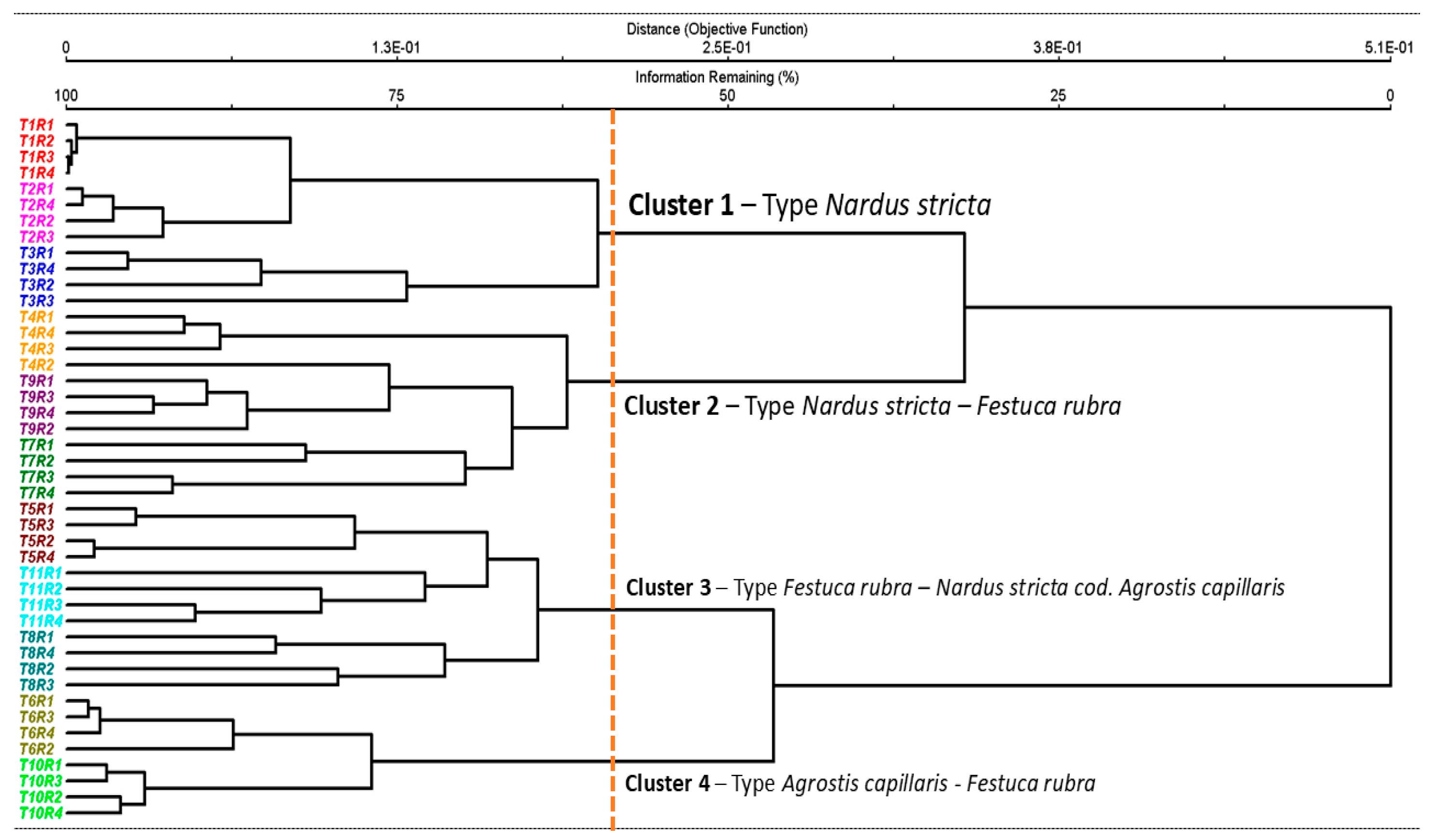 - Gârda, N.T.; Păcurar, F.; Rotar, I.; Bogdan, A. The floristic and stational characterisation of the grassland subtype Agrostis capillaris+ Trisetum flavescens from Apuseni Mountains, Romania. Res. J. Agric. Sci. 2010, 42, 454–457. [Google Scholar]
