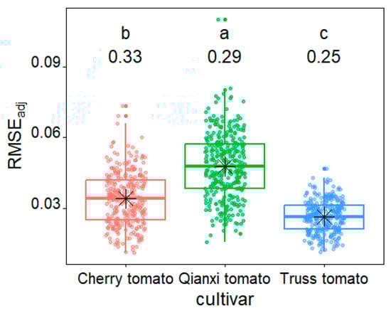 The values of RMSEadj were obtained using the explicit Preston equation (EPE). Different letters indicate significant differences among the three cultivar groups (Tukey’s HSD test at the 0.05 significance level). The numbers above the box-whisker plots represent the coefficients of variation. The horizontal solid line indicates the median, the black asterisk denotes the mean, and the whiskers extend to 1.5 times the interquartile range from the top and bottom of the box. The sample sizes for cherry tomatoes, Qianxi tomatoes, and truss tomatoes were 297, 320, and 300, respectively.