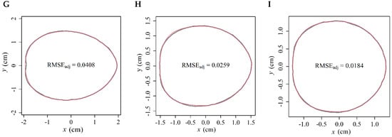 are the observed and predicted y values, respectively. W represents the maximum width of a tomato. As a rule of thumb, an RMSEadj value of 0.05 typically indicates a good fit [], i.e., the mean absolute deviation between the observed and predicted distances from the data point on the tomato profile to the midline of the profile is less than 5% of half of the maximum width of the tomato.