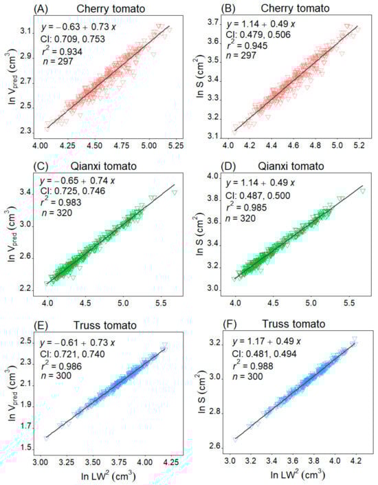 Linear regression analysis of the surface area (S) and observed volume (Vobs) of the three tomato cultivars on a log–log scale. CI represents the 95% confidence interval of the slope. The r2 value is the coefficient of determination, and n represents the sample size, which refers to the number of tomatoes.