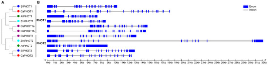 Phylogenetic and gene structure of PHOT members from different plant species. (A) Phylogenetic tree of PHOT protein sequences. (B) Exon–intron structure of PHOT genes.