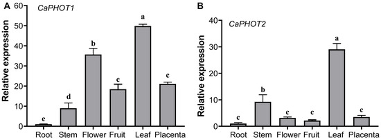 The expression of CaPHOT1 and CaPHOT2 in root, stem, flower, fruit, leaf, and placenta was analyzed using qRT-PCR. The results showed that both CaPHOT1 and CaPHOT2 are expressed in various tissues, with the highest expression levels in leaf and the lowest in root (Figure 2). In addition, CaPHOT1 also exhibits relatively high expression in flower (Figure 2A), while CaPHOT2 shows relatively high expression in stem (Figure 2B).