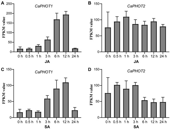 Expression analysis of CaPHOT1 and CaPHOT2 in response to JA and SA treatments. (A,B) Expression of CaPHOT1 (A) and CaPHOT2 (B) under JA treatment at different time points according to the RNA-seq data. (C,D) Expression of CaPHOT1 (C) and CaPHOT2 (D) under SA treatment at different time points according to the RNA-seq data.