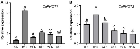 qRT-PCR analyses of levels of CaPHOT1 (A) and CaPHOT2 (B) transcripts under PCI at different time points. Data (mean ± SD) represent three replicates analyzed using the 2−ΔΔCt method, with the expression level of each CaPHOT gene at 0 h set as “1.0”. Statistical significance was assessed by one-way ANOVA with Tukey’s test, and different letters above the columns indicate significant differences (p < 0.05).