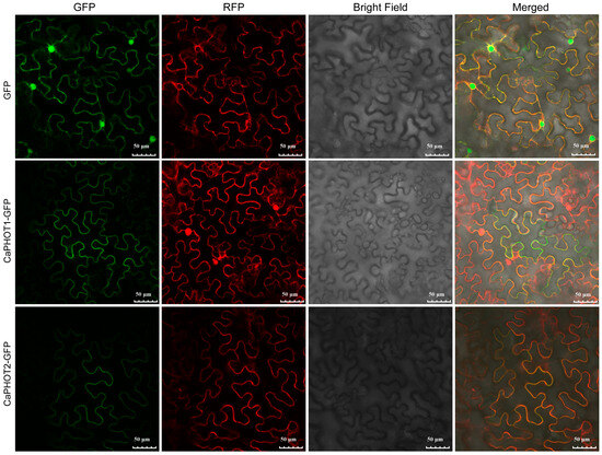 To assess the subcellular localization of CaPHOT1 and CaPHOT2, their full-length coding sequences (without stop codons) were fused in-frame to the N-terminus of green fluorescent protein (GFP) under the control of the cauliflower mosaic virus 35S promoter. These fusion constructs were transiently co-expressed with a plasma membrane marker in Nicotiana benthamiana leaves. Confocal microscopy revealed that the GFP fluorescence signal co-localized with the plasma membrane marker (Figure 5), indicating that both CaPHOT1 and CaPHOT2 are localized to the plasma membrane.