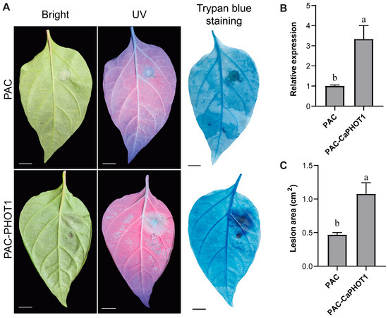 The coding region of the CaPHOT1 were amplified and inserted into the PAC overexpression vector, and the resulting recombinant vector was designated as PAC-CaPHOT1. Agrobacterium tumefaciens GV3101 strains harboring either the PAC-CaPHOT1 construct or the empty PAC vector (control) were inoculated into liquid LB medium and cultured overnight at 28 °C. Finally, the bacteria were resuspended in infiltration buffer (10 mM MgCl2, 10 mM MES, 100 μM acetosyringone, pH 5.6), and the concentration was adjusted to an OD600 of 0.8 using a spectrophotometer. When pepper plants reached the 6–8 leaf stage under the aforementioned growth conditions, the Agrobacterium suspension was drawn into a sterile needle-free disposable syringe. Twenty pepper leaves of similar size and developmental stage were randomly selected from plants at the 6–8 leaf stage grown under the aforementioned conditions for whole-leaf infiltration. After infiltration, the plants were maintained in a growth chamber at 25 °C under a 16 h light/8 h dark photoperiod. At 36 h post-infiltration, the infiltrated leaves were excised and placed on agar medium. A 20 μL droplet of a zoospore suspension (about 2000 spores) was inoculated onto each leaf. At 3 days post-inoculation, lesion sizes were measured and photographed under UV light, as well as stained by simmering in trypan blue solution on the basis of the previously described method [32].