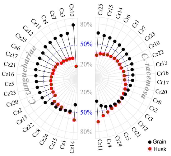 The mean P content in the husks was 2.15 and 2.65 kg·ton−1 for C. racemosa and C. zanguebariae, respectively (Figure 4). Accessions Cr24 and Cz10 showed the lowest concentrations in their species, while accessions Cz17, Cz15, Cz7, Cz3, and Cz2 obtained values close to 4 mg of P in their husks. While the concentrations of N and P in husks were higher for C. zanguebariae compared to C. racemosa, K content showed an inverse relation. On average, there was a concentration of 31.17 kg·ton−1 of K in the husks of C. racemosa accessions, and only 24.38 kg·ton−1 for C. zanguebariae accessions. Accessions Cz8 and Cz23 stood out with lower K content in their husks.
