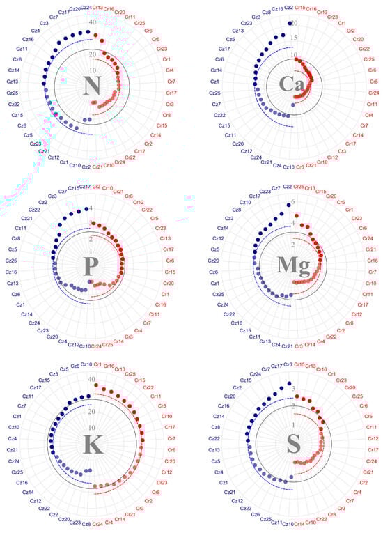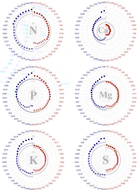 Macronutrient content (kg·ton−1) in the husks of 22 accessions of C. racemosa (Cr—red) and 22 accessions of C. zanguebariae (Cz—blue) collected in Mozambique: nitrogen (N); phosphorus (P); potassium (K); calcium (Ca); magnesium (Mg); and sulfur (S). Continuous line = overall average; and dotted line = average of each species.
