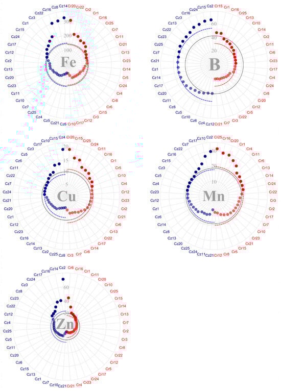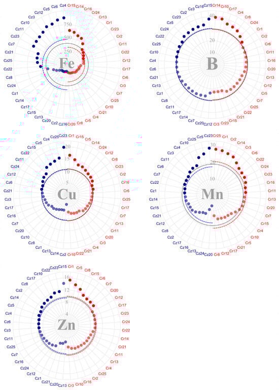 Micronutrient content (g·ton−1) in the husks of 22 accessions of C. racemosa (Cr—red) and 22 accessions C. zanguebariae (Cz—blue) collected in Mozambique: iron (Fe), copper (Cu), zinc (Zn), boron (B), and manganese (Mn). Continuous line = overall average and dotted line = average of each species.