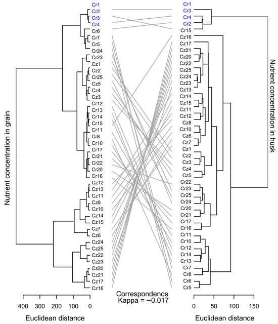 The grouping using the Unweighted Pair Group Method with Arithmetic Mean (UPGMA) considering the husk and bean nutrient content separately, showed correspondence in the formation of only one group (containing Cr1, Cr2, Cr3, and Cr4) (Figure 6). However, for husk nutrient content, the group included Cr15, unlike the grouping of accessions according to their bean nutrient content, in which Cr15 showed more than 150 units of Euclidean distance from the group above. Also, while in the concentration of nutrients in the beans, the group formed by Cr1, Cr2, Cr3, and Cr4 resembles other groups (such as that formed by Cr6, Cr7, Cr5, and Cr24), the group formed following husk nutrient content isolated other accessions by a distance greater than 150 units from Euclidean distance.