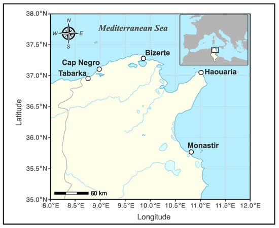 Geographic location of the five sampling sites of Crithmum maritimum L. along the Tunisian coast (Tabarka, Cap Negro, Bizerte, Haouaria, and Monastir).