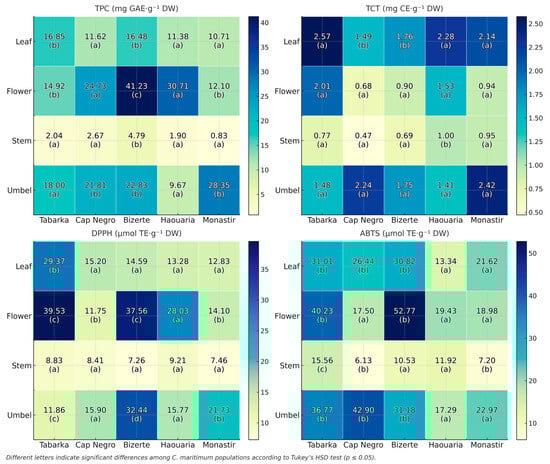 Effect of herbivory on biochemical traits in low- and high-herbivory populations. Heatmaps show site-level means for TPC (mg GAE·g−1 DW), TCT (mg CE·g−1 DW), DPPH (µmol TE·g−1 DW), and ABTS (µmol TE·g−1 DW) across four organs (Leaf, Flower, Stem, Umbel). Different letters indicate significant differences among sites according to Tukey’s HSD test (p ≤ 0.05).