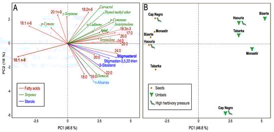 The scores plot (Figure 5B) displayed a clear separation between low-herbivory sites (Tabarka, Bizerte) and high-herbivory populations (Cap Negro, Haouaria, Monastir), with seeds and umbels forming distinguishable clusters within each group. The first two principal components explained 46.8% (PC1) and 18.0% (PC2) of the total variance.