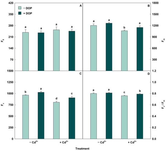 (A–D) Minimal fluorescence yield of the dark-adapted state (F0), maximal fluorescence yield of the dark-adapted state (Fm), variable fluorescence (Fv) and maximal quantum yield of PSII photochemistry (Fv/Fm) in soybean plants sprayed with DOP and exposed to Cd excess. Columns with different letters indicate significant differences from the Scott-Knott test (p < 0.05). Values described correspond to means from five repetitions and standard deviations.