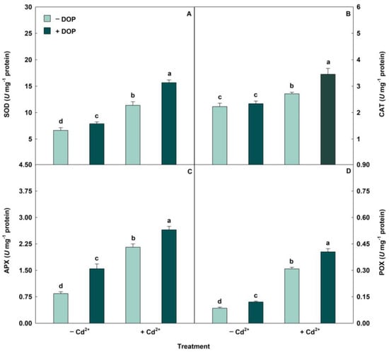 (A–D) Activities of superoxide dismutase (SOD), catalase (CAT), ascorbate peroxidase (APX) and peroxidase (POX) in soybean plants sprayed with DOP and Cd excess. Columns with different letters indicate significant differences from the Scott-Knott test (p < 0.05). Columns corresponding to means from five repetitions and standard deviations.