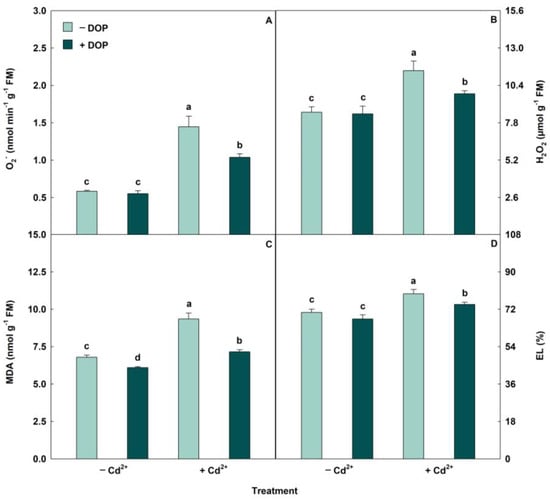 The activities of antioxidant enzymes (SOD, CAT, APX, and POX) had significant increases when subjected to Cd stress (Figure 2). However, treatment with 100 µM DOP combined with 500 µM Cd2+ resulted in increases (p < 0.05) in SOD, CAT, APX and POX activities of 38%, 27%, 23% and 31%, respectively, compared to the same treatment in the absence of DOP. Regarding stress indicators, excess Cd stimulated the ROS accumulation (Figure 3). However, spraying DOP on plants stressed with Cd caused significant reductions in the levels of oxidative compounds superoxide (O2−), hydrogen peroxide (H2O2), malondialdehyde (MDA), and electrolyte leakage (EL) of 28%, 14%, 23% and 6%, respectively, when compared to plants treated with Cd alone.