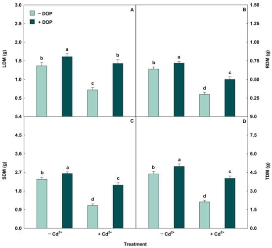 Biomass was significantly reduced in plants exposed to Cd excess (Figure 4 and Figure 5). However, DOP sprayed in plants stressed with Cd2+ induced increases in leaf dry matter (LDM), root dry matter (RDM), stem dry matter (SDM), and total dry matter (TDM) of 89%, 67%, 98%, and 89%, respectively, compared to plants exposed only to Cd excess.