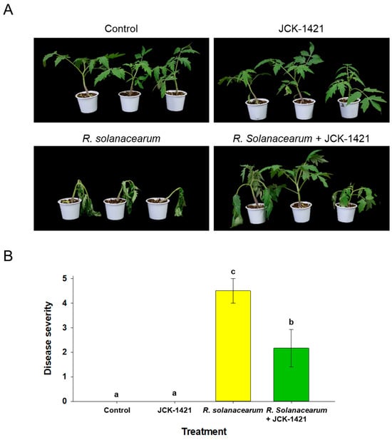 Effect of L. enzymogenes JCK1421 foliar spray on resistance to Ralstonia solanacearum in tomato seedlings. (A) Representative phenotype at 14 days post-inoculation. (B) Disease severity (0–5 index) scored at 14 days. Bars show mean ± SD; different letters indicate significant differences among treatments based on LSD test, p < 0.05.
