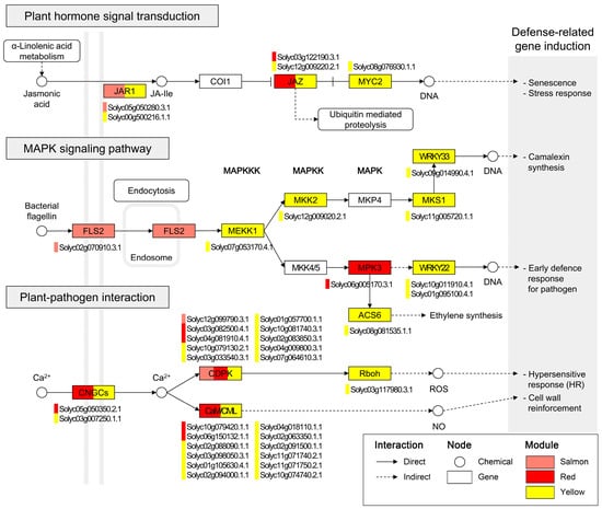 Within the plant hormone signal transduction pathway, genes from three modules were linked to core components of the jasmonic acid (JA)-dependent signaling cascade: jasmonate resistance 1 (JAR1) (Solyc05g050280.3.1; Solyc00g500216.1.1), jasmonate ZIM-domain (JAZ) family members (Solyc03g122190.3.1; Solyc12g009220.2.1), and MYC2 (Solyc08g076930.1.1), implicating JA-dependent transcriptional reprogramming in JCK1421-induced defense. For the MAPK signaling pathway, the salmon module mapped to FLS2 (Solyc02g070910.3.1), a receptor for bacterial flagellin, while the red and yellow modules contained kinase tiers MEKK1 (Solyc07g053170.4.1), MKK2 (Solyc12g009020.2.1), and MPK3 (Solyc06g005170.3.1), with downstream transcription factors WRKY22 (Solyc10g011910.4.1; Solyc01g095100.4.1) and WRKY33 (Solyc09g014990.4.1), outlining a canonical cascade.