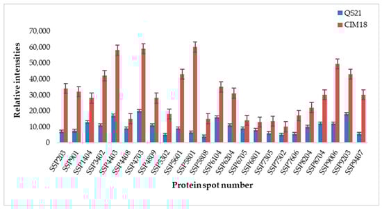 Twenty-four protein spots which significantly increased twofold or more in the tolerant (CIM18) compared to susceptible (QS21) inbred line under combined drought and heat stress treatment. Data shown are means ± SD of three biological replicates.