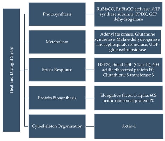 Proteomic analysis is increasingly becoming a biomarker of choice in marker-assisted selection (MAS) studies, where the unique protein associated with a trait is used to identify tolerant genotypes []. Proteomic research into maize plants subjected to individual abiotic stressors is well documented, but far fewer investigations have been conducted under combined stresses []. Previous proteomic studies have indicated that gene expression maybe altered, resulting in protein expression changes in plants subjected to heat and drought stress.