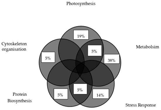 The flow chart provides a clear overview of how the proteins were grouped into broader categories: photosynthesis, metabolism, stress response, protein biosynthesis and cytoskeleton organization. Eleven protein spots were unique only to the tolerant inbred line (CIM18), as shown in Figure A2. The percentage of proteins uniquely upregulated in the tolerant CIM18 inbred line is shown in Figure 3.