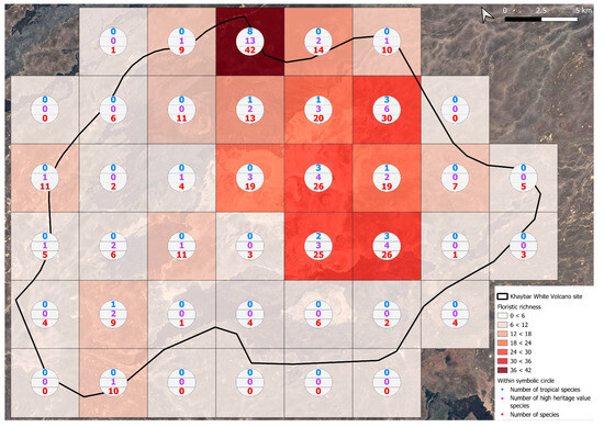 A spatial comparison of values within the symbolic circles revealed a positive correspondence between total bryophyte richness and the number of tropical and high heritage value species. Grid cells exhibiting the highest total species counts (≥30 species; dark red shading) consistently contained elevated numbers of both tropical taxa (up to 8) and high heritage value taxa (up to 13). This pattern was particularly evident in the northeastern and central-eastern parts of the Khaybar White Volcano Geopark. Conversely, cells with low overall species richness (white or light grey shading; <6 species) generally lacked tropical and heritage species, with most of these cells displaying zeros across both categories.