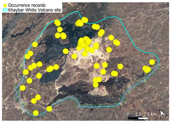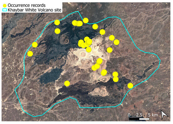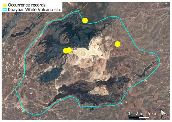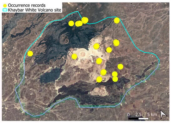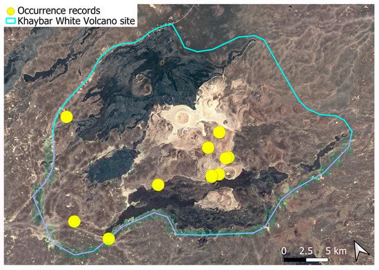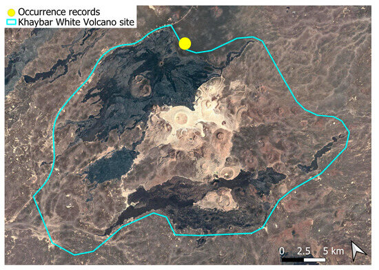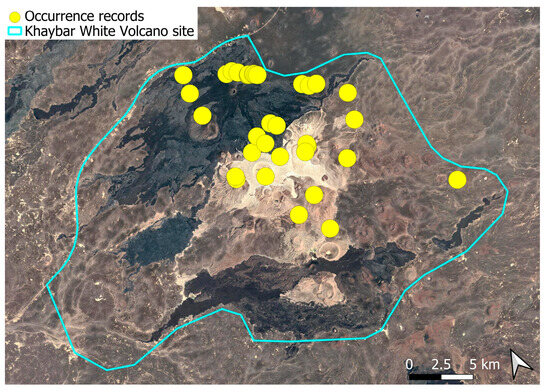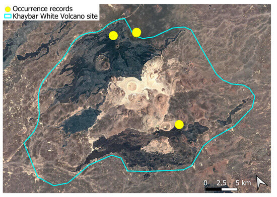 Each species was mapped individually, with yellow dots indicating all recorded localities. In some cases, points may overlap due to the geographical proximity of the sites. The boundary of the Khaybar White Volcano Geopark is shown on every map.