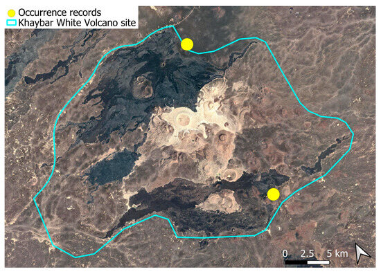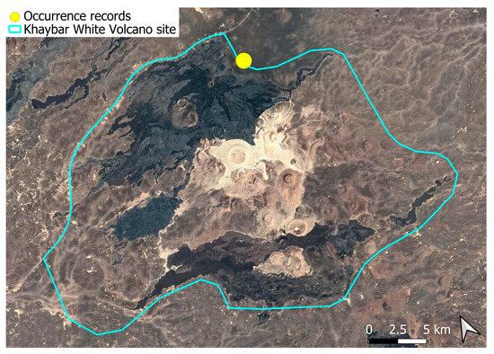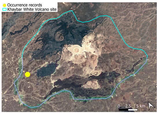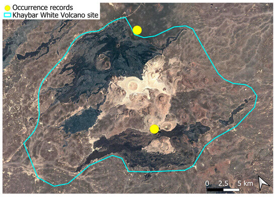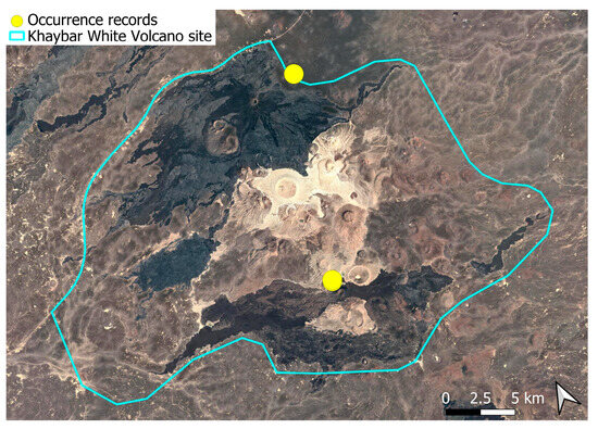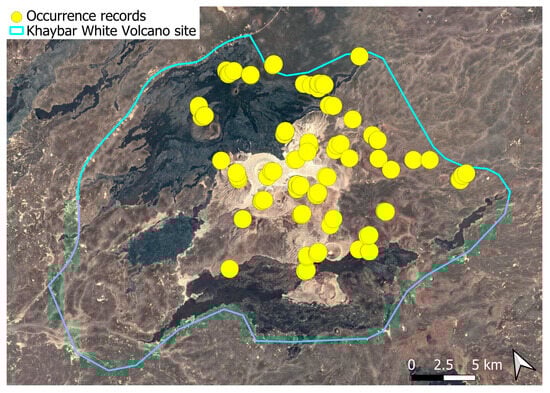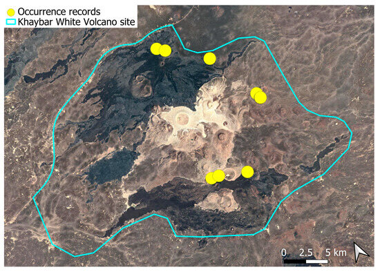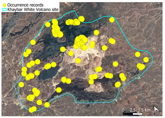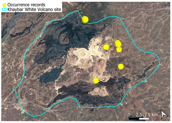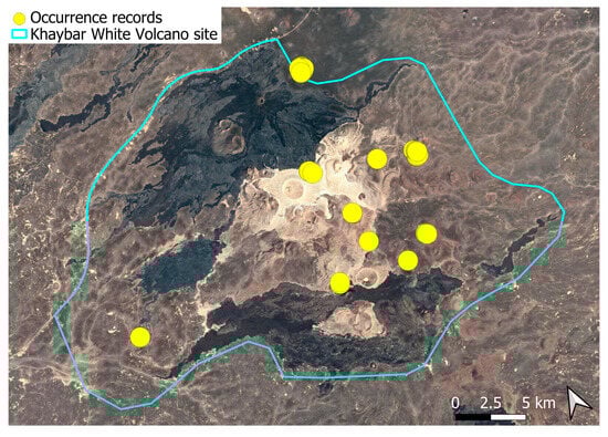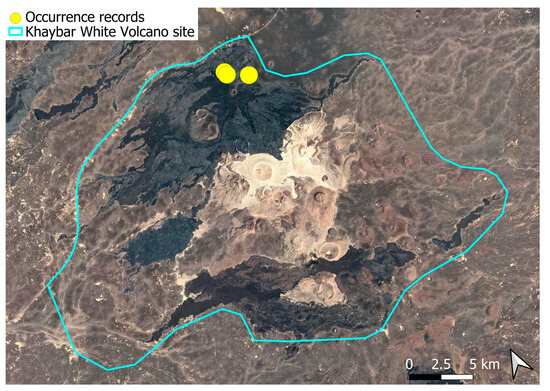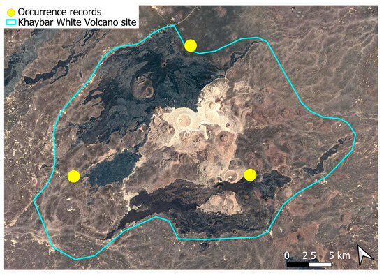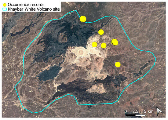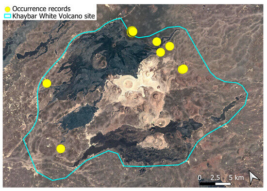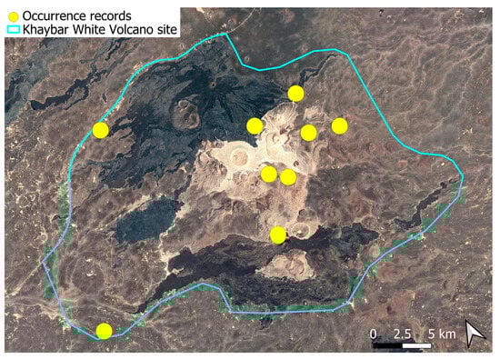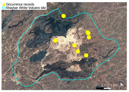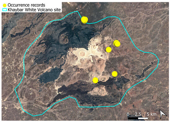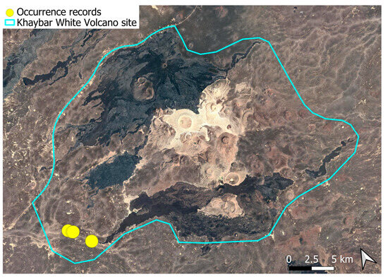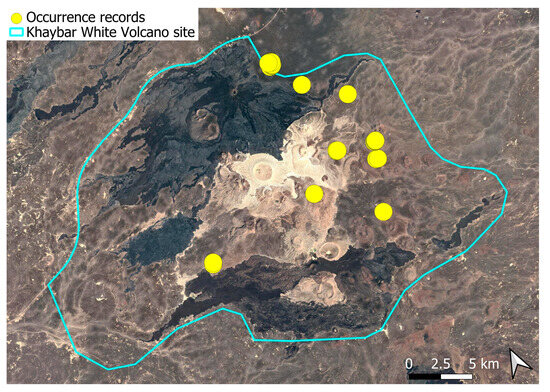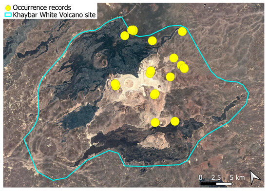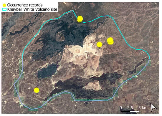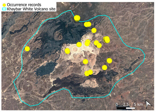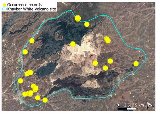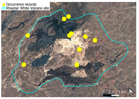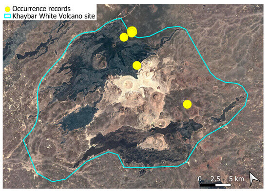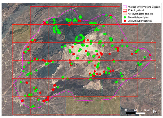The surveys were conducted from 21–23 February 2024, and 15 February to 17 March 2025, with 551 selected sites surveyed (Figure 58). To ensure a systematic and comprehensive bryofloristic inventory of the study area, a regular grid composed of 5 × 5 km cells was superimposed on high-resolution aerial imagery. This grid provided a spatial framework to structure the field campaign, enabling homogeneous coverage of the entire site and facilitating logistical planning. Whilst the primary focus was the Khaybar White Volcano Geopark area, the boundary of which can be seen in Figure 58, the 5 × 5 km cells did extend outside the Geopark area. These areas were surveyed with the same diligence as those inside the Geopark boundary.