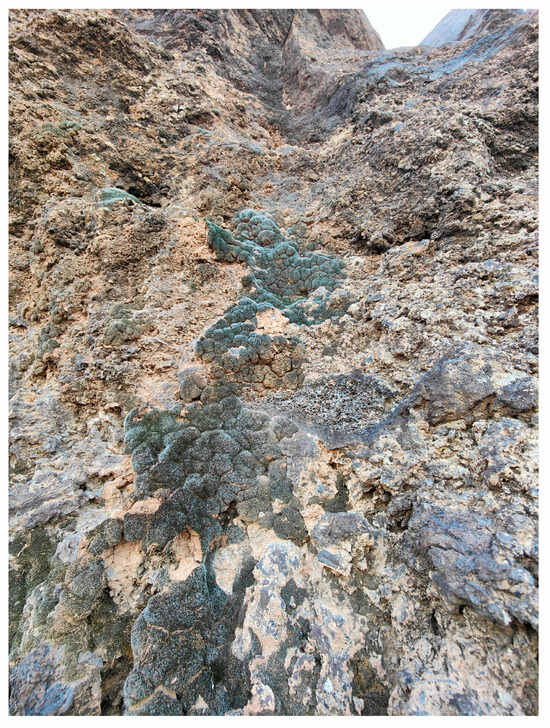 A pantropical species not previously recorded in the Arabian Peninsula, A. euchloron was found in the eastern half of the Khaybar White Volcano Geopark, exclusively on fumarolic volcanic slopes (Figure 4). While its distribution remained highly localized, it was frequent within its specialized microhabitat. Local populations were often well developed, sometimes covering several tens of cm2, and occasionally extending up to one square meter under favorable conditions. The species was entirely sterile, with no gametangia observed, like in A. aestivum.