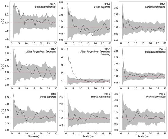 Spatial distribution patterns of dominant tree species in subalpine secondary forests of western Sichuan, China. The black line represents the univariate pair-correlation function g(r), indicating the degree of spatial aggregation or regularity of a single species at different spatial scales. The gray shaded area shows the 95% confidence envelope generated from 99 Monte Carlo simulations under the null model of complete spatial randomness. Values of g(r) above the upper envelope indicate significant aggregation, values below the lower envelope indicate spatial regularity, and values within the envelope suggest random distribution.
