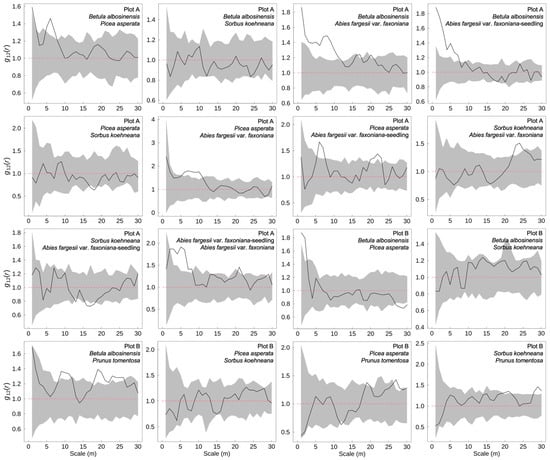 Interspecific spatial associations among dominant tree species in subalpine secondary forests of western Sichuan, China. The black line represents the observed bivariate pair-correlation function g12(r), which describes the spatial association between two species across different spatial scales. The gray shaded area shows the 95% confidence envelope generated from 99 Monte Carlo simulations under the null model of complete spatial randomness. Values of g12(r) above the upper envelope indicate significant positive association, values below the lower envelope indicate negative association, and values within the envelope indicate no significant spatial association between species.