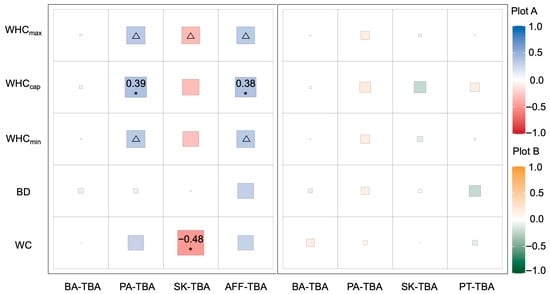 Relationships between the dominance of dominant tree species and soil water-holding capacities in subalpine secondary forests of western Sichuan, China. BD = bulk density (g/cm3); WC = gravimetric moisture content (%); WHCmax = maximum water-holding capacity (g/cm3); WHCcap = capillary water-holding capacity (g/cm3); WHCmin = minimum water-holding capacity (g/cm3); TBA = total basal area of each species within the plot (cm2). Abbreviations: BA: Betula albosinensis; AFF: Abies fargesii var. faxoniana; PA: Picea asperata; SK: Sorbus koehneana; PT: Prunus tomentosa. *: p < 0.05; △: p < 0.1. The numerical values in the figure represent Spearman’s rank correlation coefficients (r) between tree species dominance and soil water-holding capacity variables.