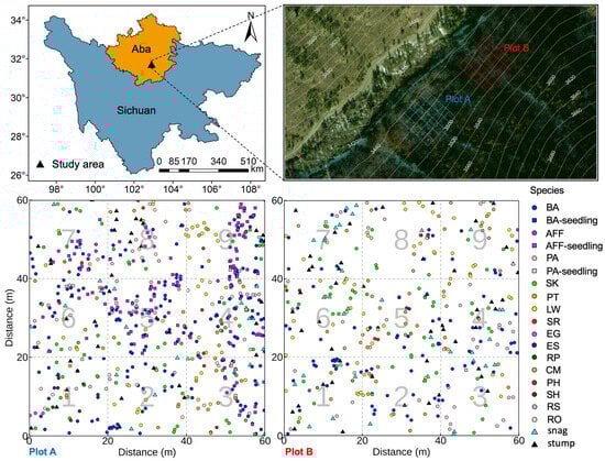 In early July 2023, two representative 1-hectare plots were established within the core area of the natural secondary forest. Within each plot, a central 60 m × 60 m area was precisely delineated using a total station. This central area was further subdivided into nine standard subplots (each 20 m × 20 m) to facilitate the systematic investigation of stand structure, tree species composition, and spatial distribution patterns. The spatial distributions of trees, shrubs, snags, and stumps within the plots are shown in Figure 5.