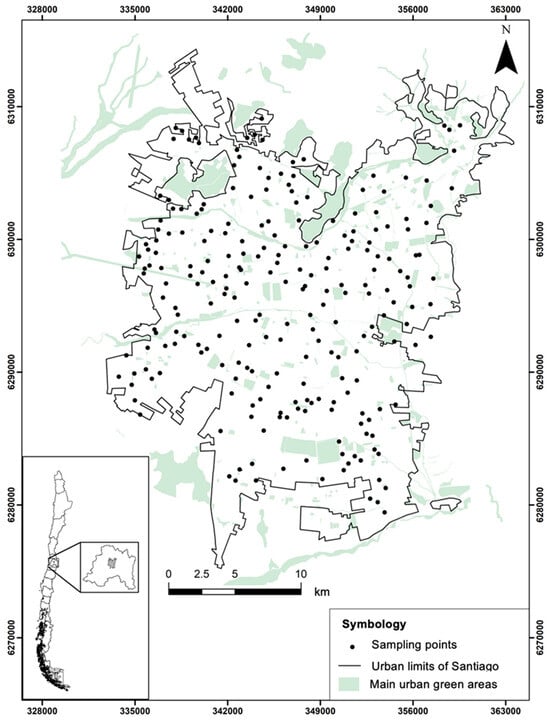 Geographic distribution of the 234 sampled points within the urban area of Santiago.